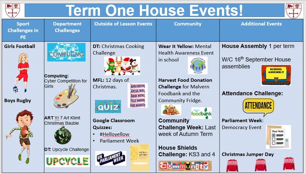 Last week our staff house leaders delivered the first House Assemblies of the year, we welcomed our new Year 7 house members and also two new staff House Leaders. Mr Swan takes on Leadership of Ballard House and Ms Rowley, Elgar. As part of this assembly we launched our Autumn Term House Calendar. We are committed to living out our vision of ‘Life in all its fullness’ John 10 10 in everything we do and so our House Competitions provide great opportunities for our school community to learn new skills and also demonstrate our values of Belief, Trust, Challenge and resilience. These are the challenges taking place in the Autumn term.